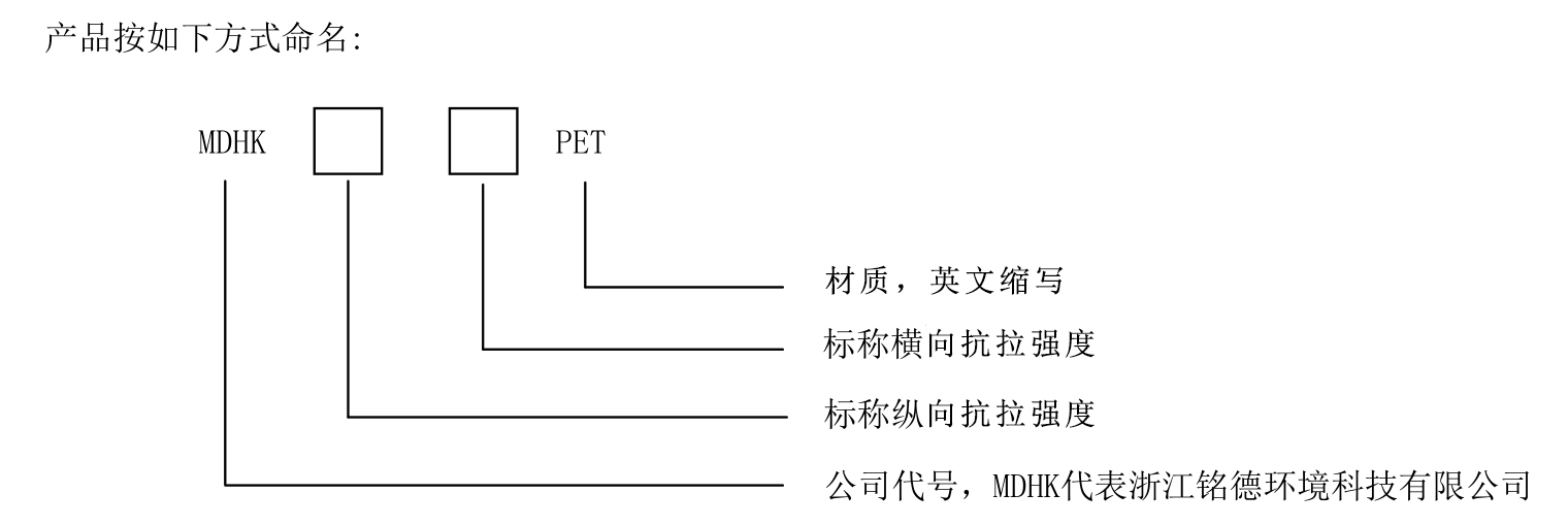 產(chǎn)品命名示例:MDHK100/50PET表示浙江銘德環(huán)境科技有限公司生產(chǎn)的標(biāo)稱抗拉強度為橫向100kN/m,縱向50kN/m的高韌聚酯有紡?fù)凉げ肌?/div>